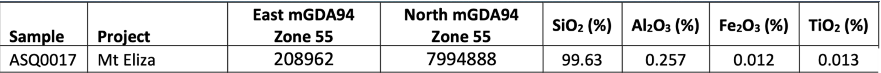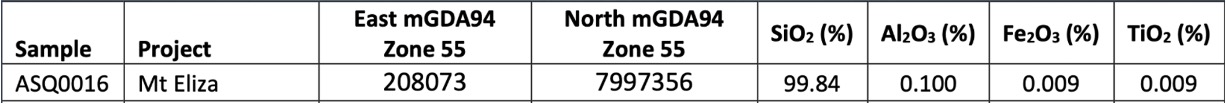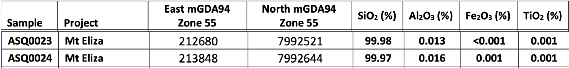ASQ have collected a number of rock chip samples within the project area. These samples have returned results up to 99.98% SiO2 (See Table 1, 2 and 3).
