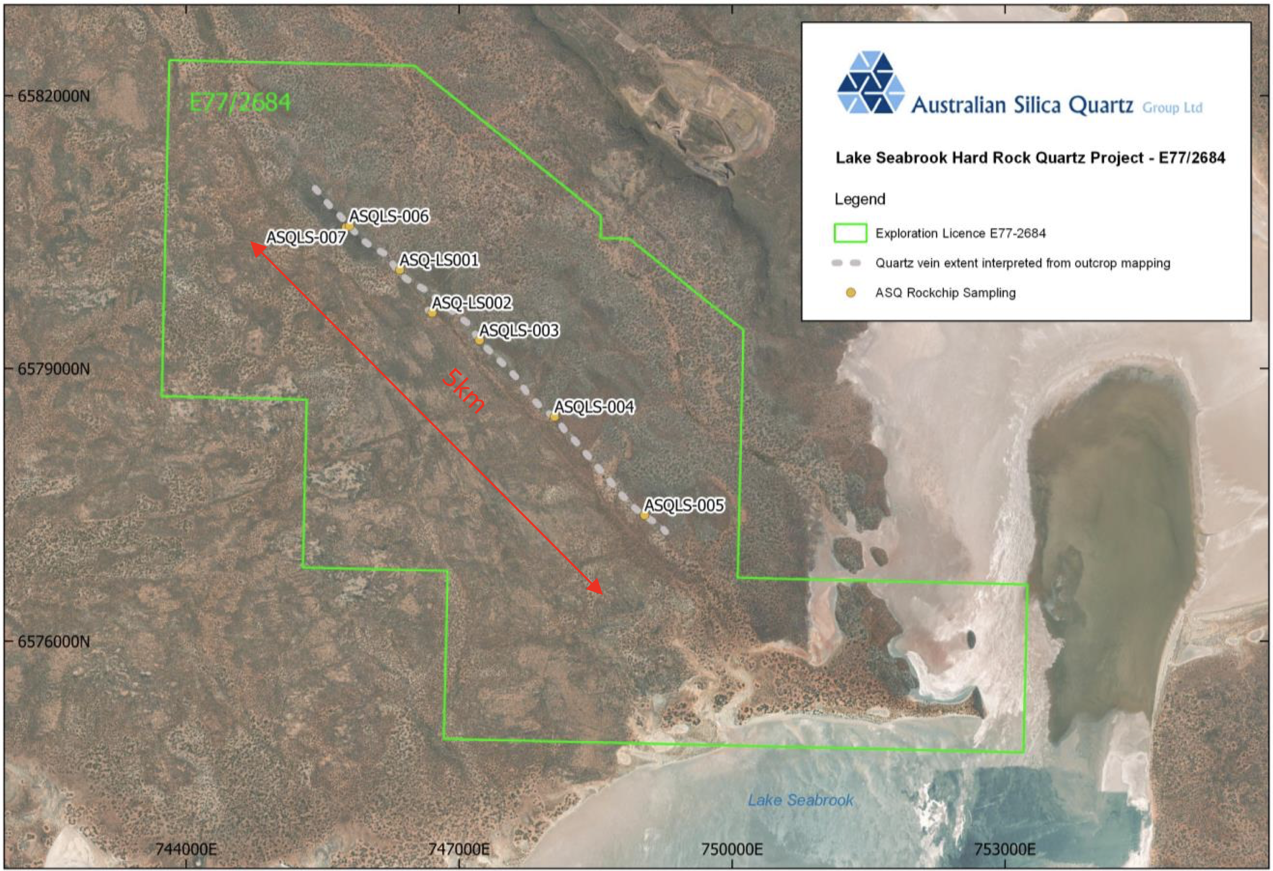 Figure 1 Seabrook High Purity Quartz Project – E77/2684 showing ASQ rock chip sampling locations and interpreted quartz vein extent